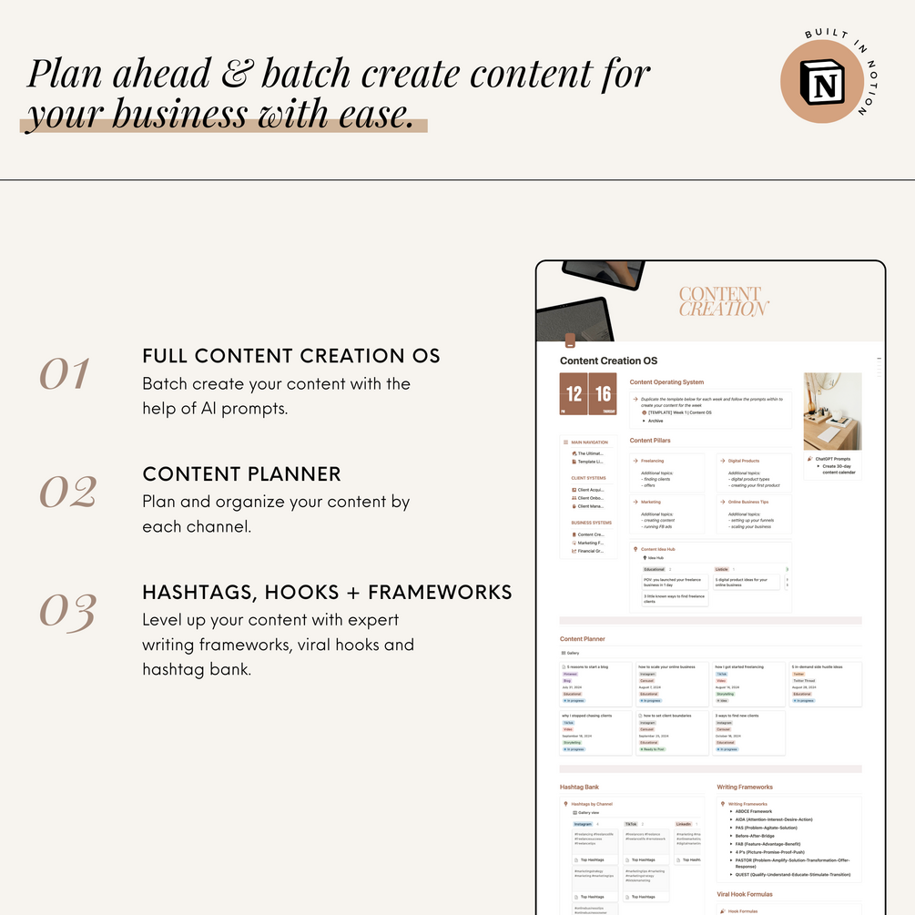 - Freelance Dashboard: Your dashboard center for all things client onboarding, tracking client projects, managing your business finances, marketing funnel, content planning and more