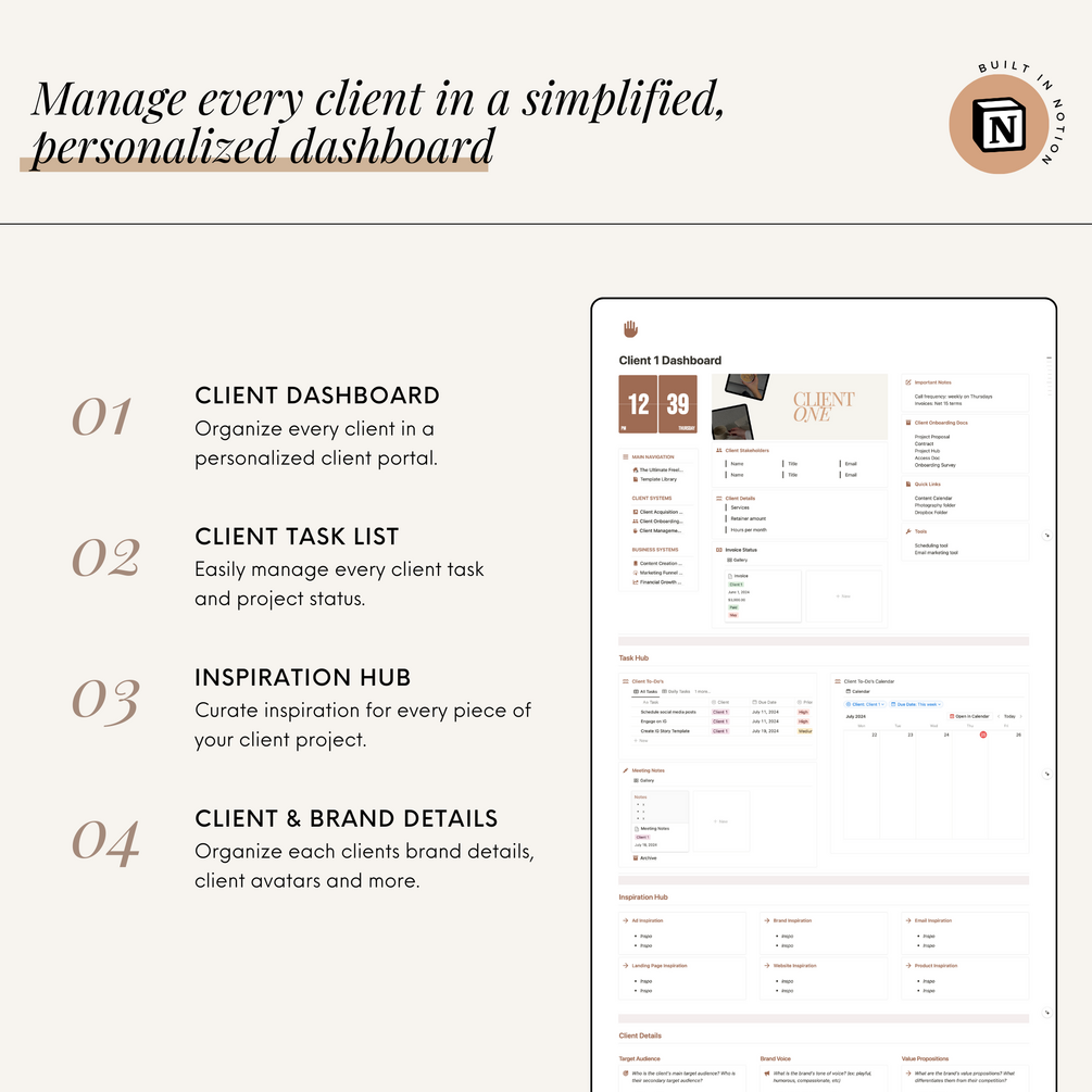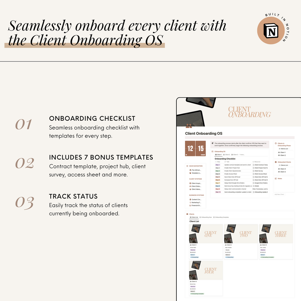 - Client Onboarding Dashboard: Make a fantastic first impression with a streamlined onboarding system, including every template you need for each step!